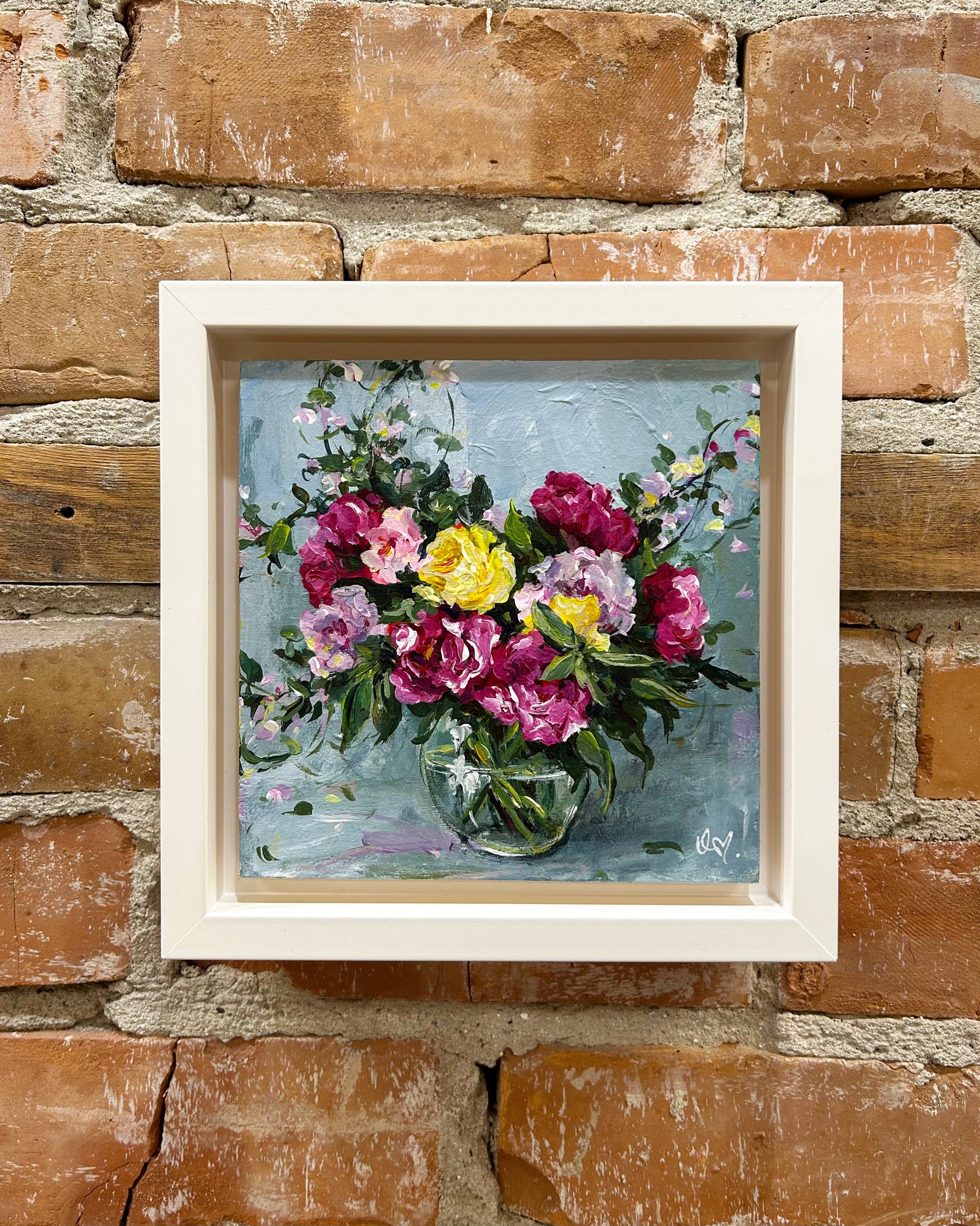 Painted with the highest quality acrylic paints and varnished for preservation. Measuring 6 x 6 inches on 1.5 inch deep wood panel. The sides are left natural wood, and is framed in a white gallery frame, wired on the back ready to hang or sit.